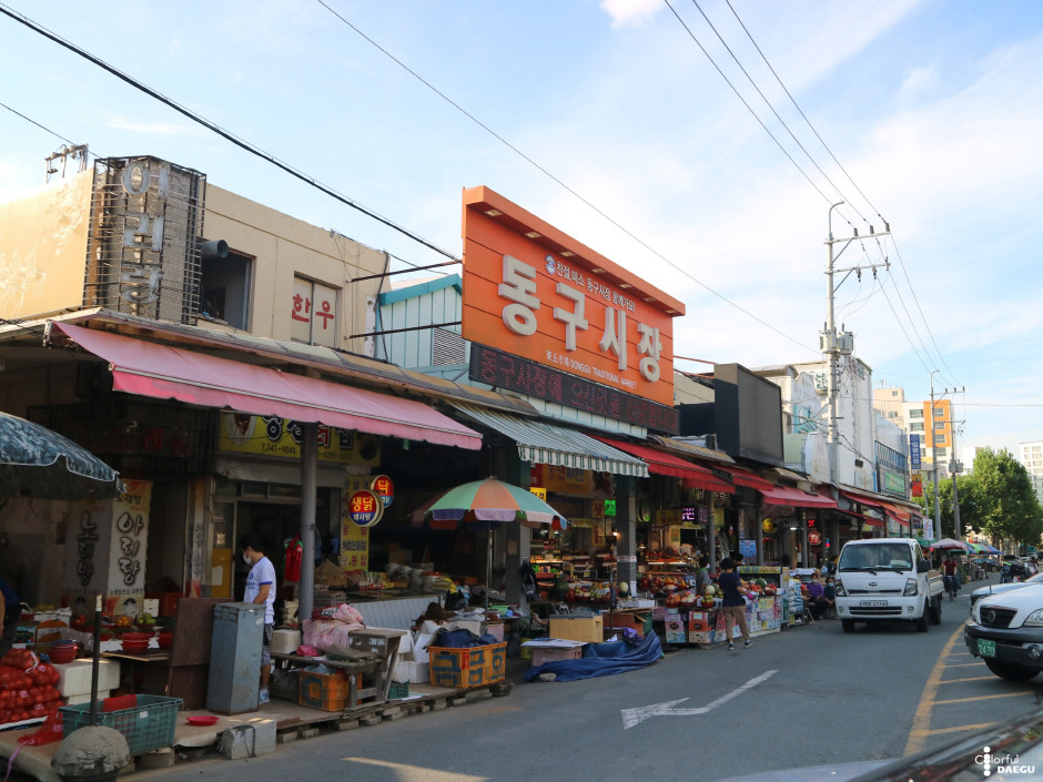 동구시장은 1977년 문을 연 대구의 전통시장이다. 2007년에는 대구 최초로 모범시장으로 선정됐다. 시장에서는 칼국수, 부침개 등 즉석에서 요리한 각종 먹거리를 판다. 이 밖에 과일류와 채소류 등을 구입할 수 있다. 인근 관광지로는 화랑공원, 동촌유원지, 대구시니어체험관, 대구아쿠아리움 등이 있다.