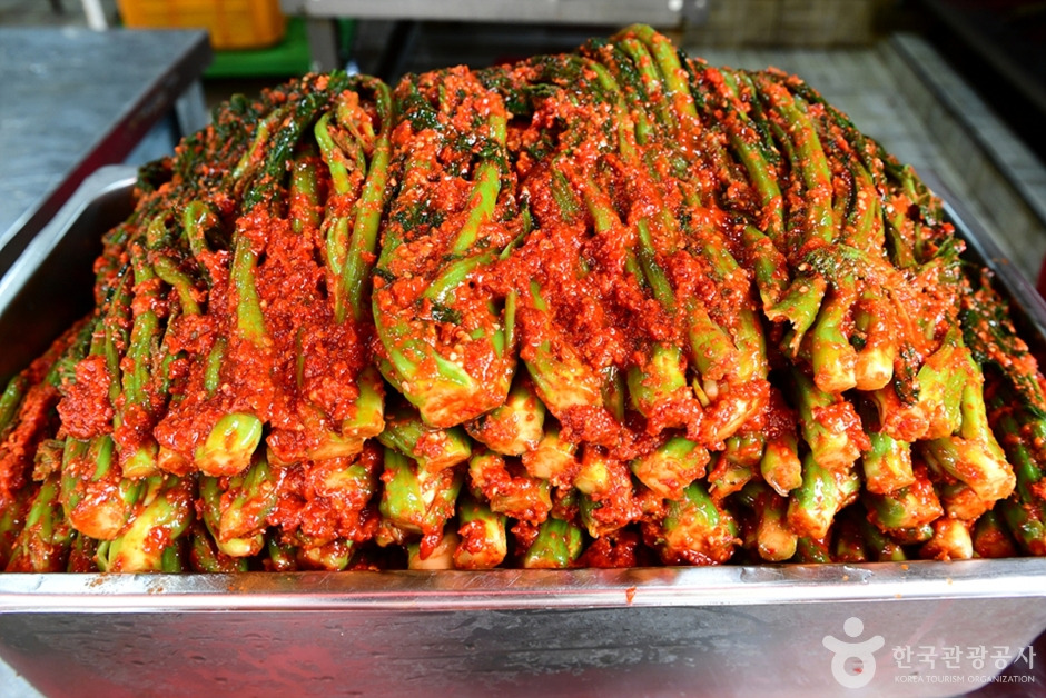 여수 돌산갓은 여수의 명물 특산품으로 따뜻한 해양기후와 풍부한 유기질 토양에 해풍까지 최적의 재배환경으로 잎이 부드럽고 톡 쏘는 맛이 일품이다. 특히 겨울의 추운 날씨를 견디고 봄에 자란 돌산갓은 맛이 좋고 실하다 하며, 다른 지역의 갓에 비해 부드럽고 빨리 시어 지지 않아 더 맛있으며 무기질 비타민 함량도 높다고 한다. 여수의 명물로 톡 쏘는 맛이 일품인 돌산갓 중에서도 겨울을 이겨내고 자라 가장 맛이 좋다는 봄에 수확한 갓으로 만든 김치는 더 맛있어 인기가 높다고 한다. 아삭하면서 적당히 짭짤한 맛을 내는 갓김치를 위해 세척하는 과정을 시작으로 갓김치의 맛을 좌우하는 양념은 고춧가루, 배뿐만 아니라 밴댕이, 표고버섯, 무 등을 넣어 끓인 육수를 넣은 특별한 비법의 양념으로 풋내가 나지 않도록 많이 버무리지 않고 숙성해 돌산 갓김치 맛의 비법을 살려 만든다고 한다. 매콤하면서도 칼칼하고 특유의 향과 풍미가 일품으로 아삭하고 톡 쏘는 맛이 별미이고 숙성이 되면 될수록 더 감칠맛이 돌기 때문에 인기라고 한다. 맛으로 입소문이 나 줄서서 구매하는 곳이다. 여수 향일암을 둘러보고 내려오는 길에 갓김치를 시식 후 구매 가능하고 무료 막걸리를 함께 즐길 수 있다.