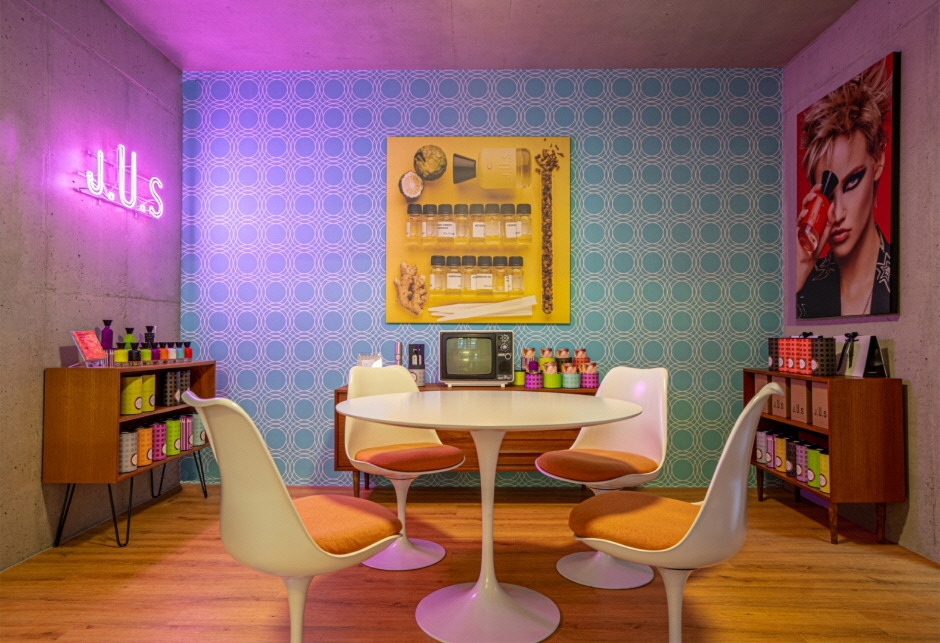 메종쥬 성수 부티끄의 향기는 기존 틀을 유연하게 해석한 트렌디 하면서도 탁월한 품질을 갖추고 있다. 생동감 넘치는 디자인에 다채로운 컬러를 입힌 빈티지 팝아트 감성을 엿볼 수 있으며, 새로운 세대의 대표적인 프랑스 마스터 조향사와의 창의적인 콜라보 제품들을 만나볼 수 있다. 메종쥬는 흔히 경험할 수 없는 독특한 향수를 찾는 사람들을 위해 디자인되었다. 다양한 보틀 사이즈의 향수가 준비되어 있어 용도에 따라 구매 및 시향이 가능하다.